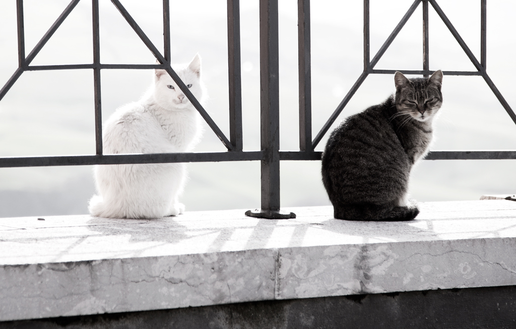 Davvero intrigante per come gli elementi sono disposti sulla scena.. concordo con Mauro, gatto scuro e gatto chiaro, simmetricamente sistemati uno al di la e uno al di qua della ringhiera, ognuno che occupa la propria porzione di spazio nel frame... e poi sono due mici BELLISSIMI!! e io vado sempre in brodo di giuggiole quando ne vedo uno