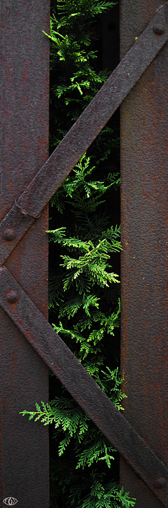 Un bel particolare, con la vegetazione che si affaccia qua e là oltre la prigione dietro la quale l'abbiamo chiusa. Un filo di nitidezza in più avrebbe reso meglio l'interessante matericità del metallo. Il formato può essere indigesto e forse la sola metà inferiore, più articolata dell'altra, poteva essere ugualmente efficace (magari inquadrando già così al momento dello scatto).