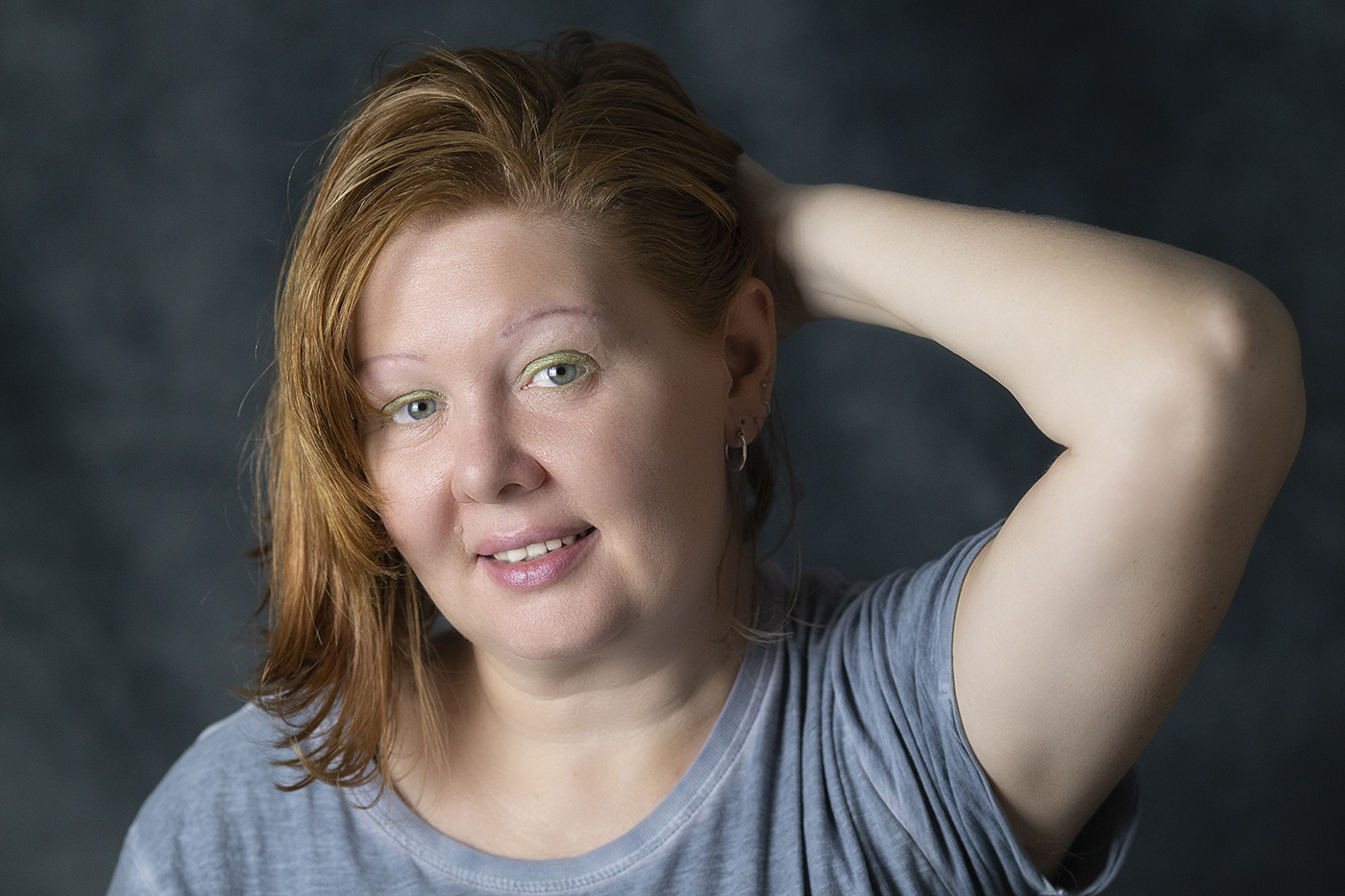 Sorridente, divertita e sicuramente in sintonia con il fotografo nonostante un percepibile velo di timidezza, e questa è una cosa importante.Il braccio non so se sia funzionale o meno,crea dinamismo ma toglie spontaneità. Buona la gestione della luce e delle cromie sul volto, forse da abbassare di un nulla la luminosità sul braccio . Ciao