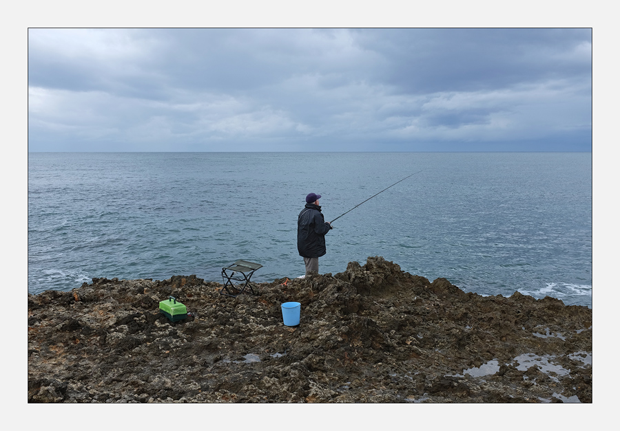 Mi è piaciuta appena aperta, ma devo ammettere che a tirare l'occhio è stato il secchio e il suo colore così simile al cielo, a questo aggiungi che se escludiamo il pescatore e la restante attrezzatura, i colori rimangono solo due Wink