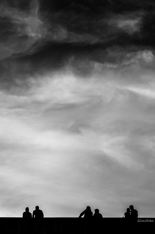 Non sono aloni ma un filo bianco di circa 1/2 pixel, visibile specialmente attorno alla coppia silhouettata a destra, ed è dovuto a particolari condizioni di controluce e/o a un po' troppa maschera di contrasto (vedere sotto dettaglio ingrandito).