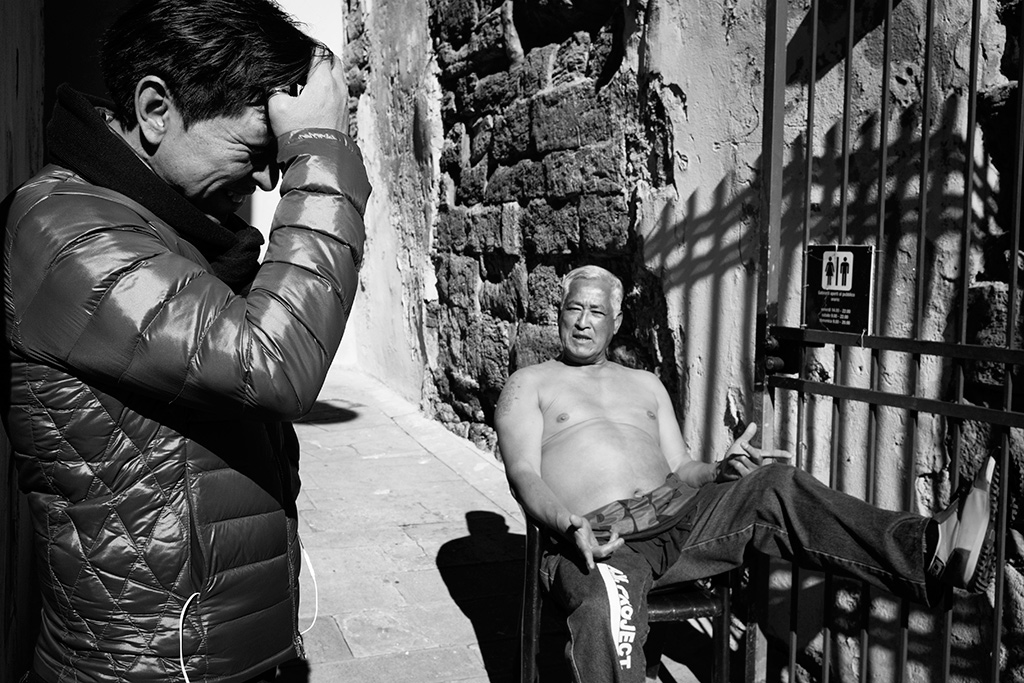 Bella la gestualità dei due personaggi e la composizione sulla diagonale che si sviluppa dalla mano del soggetto di sinistra al piede di quello di destra.Ottimo il bn.Complimenti!  |