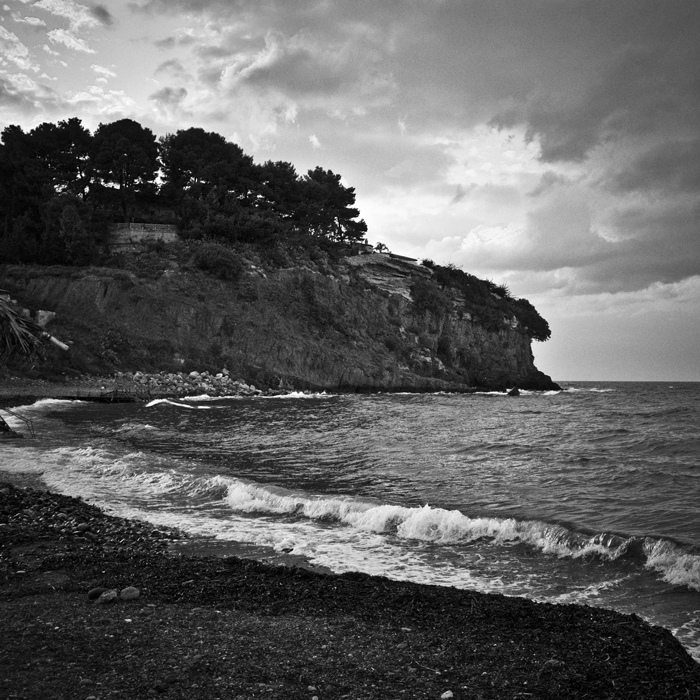 Bella la sinusoide descritta dalle onde che prosegue in alto col profilo del promontorio, in questo paesaggio con mare e cielo agitati...anche secondo me era meglio se facevi un passo indietro