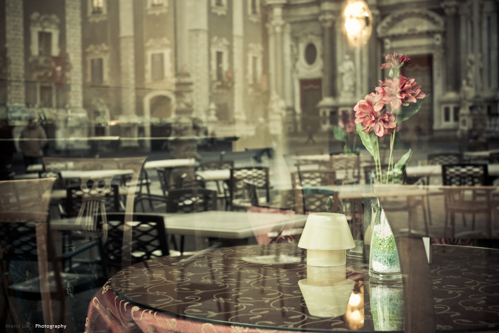 Una bella foto, con una sapiente gestione dei diversi piani sovrapposti, in cui si sfuma la divisione fra i tavolini dentro e fuori, mentre l'architettura esterna potrebbe essere anche una prestigiosa carta da parati interna. Il punto di colore caldo ben si delinea sullo sfondo di un gradevolissimo viraggio. Mi piace molto!