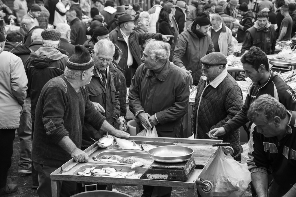 Il distinto signore con gli occhiali sembra indicare un bellissimo tonnetto (lo sarà? Io il pesce lo riconosco meglio cucinato ...), piuttosto timidamente e quasi timoroso di essere ... stroncato da una richiesta economicamente eccessiva (tempo di crisi ...), ma gli atteggiamenti di molti altri personaggi che popolano la scena meritano di essere osservati con attenzione.