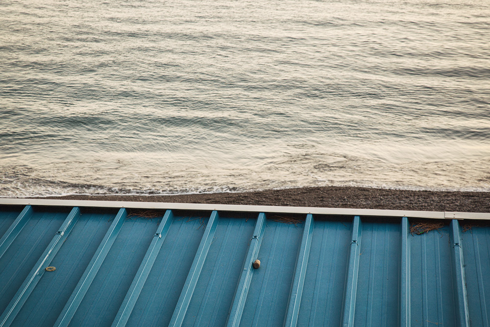 Invano cerco una geometria formale e tendo a ruotare la testa a destra, nel tentativo di rendere verticali le greche della lamiera di copertura in basso.