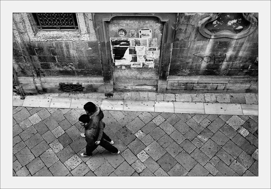 Bello scatto e bn,ottima anche la composizione con le due figure sul muro che sembrano irridere la tenera coppia.Complimenti! Ciao,Sergio.  |