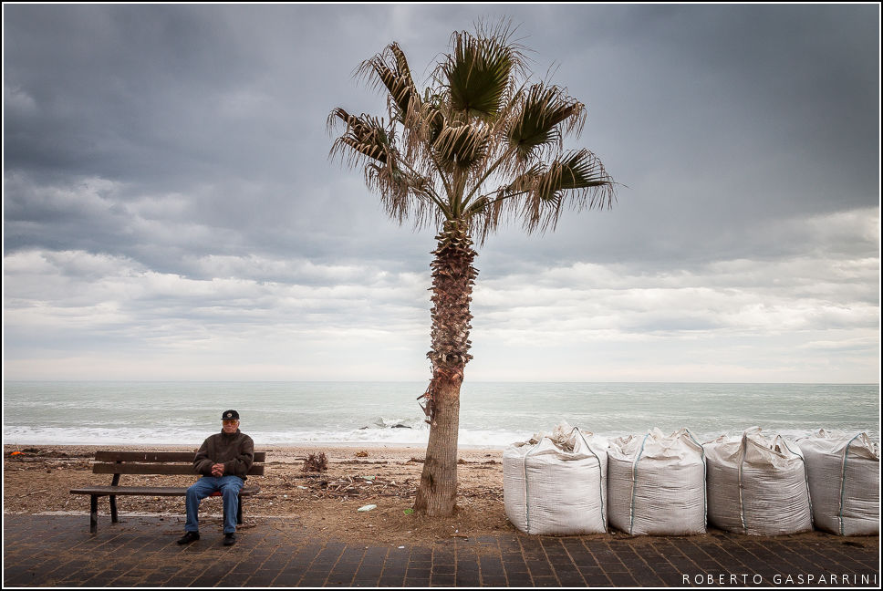 Sarà la cruda solitudine del mare d'inverno, sarà la palma che sembra quasi una sopravvissuta, sarà l'anziano seduto che congela il ricordo delle estati affollate e piene di vita, saranno quei sacconi (di terriccio? di sabbia?) messi lì "per qualcosa", ma apparentemente abbandonati...