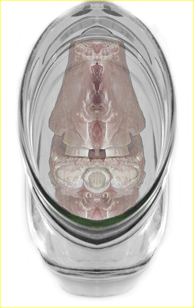 Nell'assemblare l'oggetto all'interno del contenitore hai lasciato la sua opacità non al 100%, si vede (come evidenziato dalla freccia gialla), il fondo del contenitore.