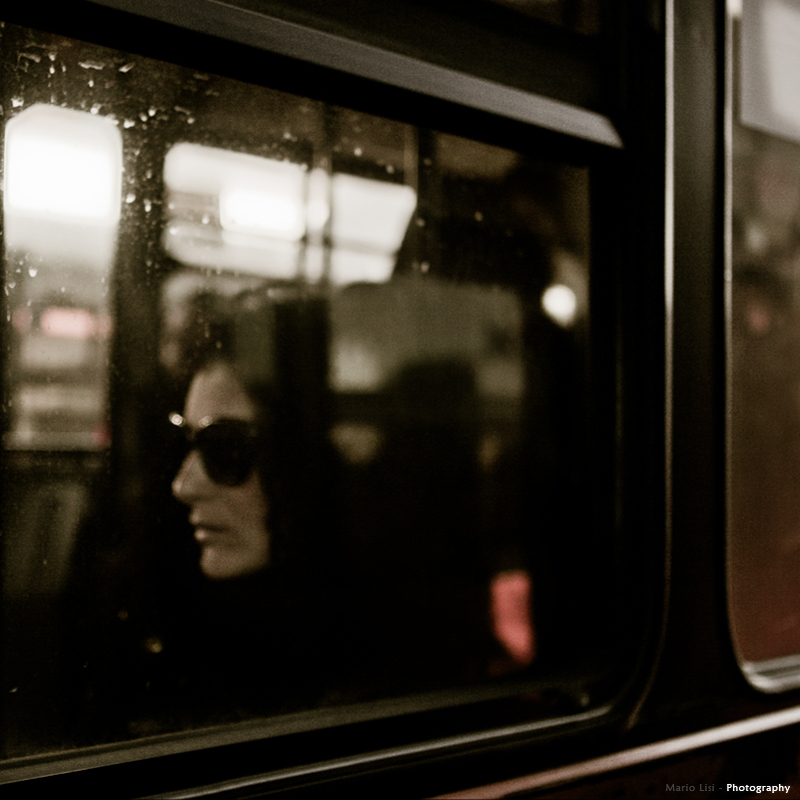 il vetro sporco, i riflessi, i grossi occhiali scuri che coprono parte del viso della donna... tutto crea un'atmosfera di mistero, c'è spazio per la lettura di una storia. Io ci leggo una fuga, programmata, da qualcosa o da qualcuno... insomma... mi piace un sacco  |
