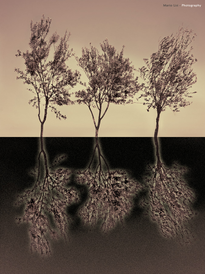 Ciao Mario, pur apprezzando l'idea e le cromie trovo la realizzazione non all'altezza... due sono gli appunti che mi permetto di fare (sempre in senso propositivo). Nella parte speculare gli aloni che avvolgono gli alberi terminano di netto sulla linea di giunzione e questo fa perdere continuità alla scena che è fortemente basata proprio su questa sensazione. Inoltre l'albero centrale non è perfettamente allineato alla sua parte speculare.
