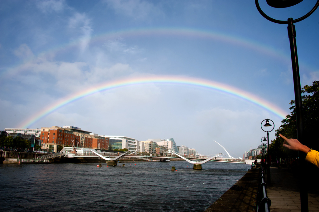 L'evento atmosferico è sempre tanto stupefacente che valeva lo scatto...nonostante la manina indicante, ti dirò che sono attirata molto di più dalle strutture portanti del ponte, che mi ricordano un volo di gabbiani in coppia, quasi d'infilata sotto al 'tunnel' descritto dal doppio arcobaleno; il primo lampione infilato a metà disturba un po'...