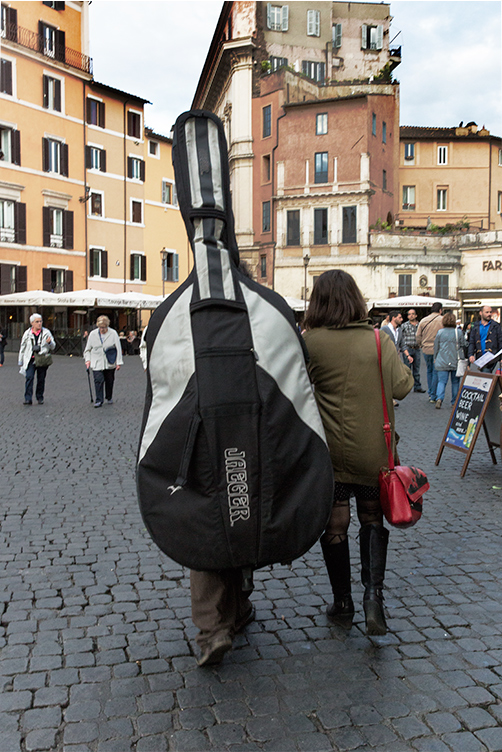 Proverei una conversione in B/N, e non solo per rendere le gambine più uniformi al resto del "corpo": sono portato a credere che ci sia la possibilità di innescare un gioco di ripetizioni tra le porte e le finestre dei palazzi sullo sfondo, e la porzione di fodero corrispondente al manico dello strumento.