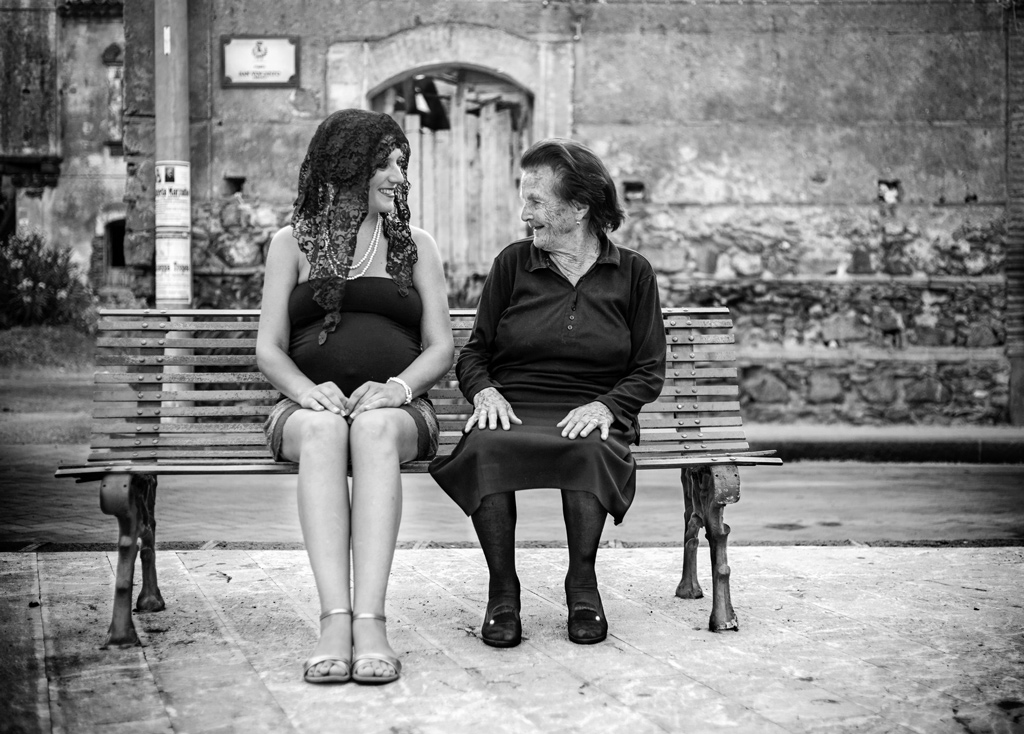 Ottimo scatto, idea e bn. La signora anziana però mi sembra distratta, nel senso che poteva guardare in viso la ragazza, il pancione......invece pare che guardi la collana, oppure le avrai chiesto di guardare alla sua destra e alla fine si è un po "confusa"....