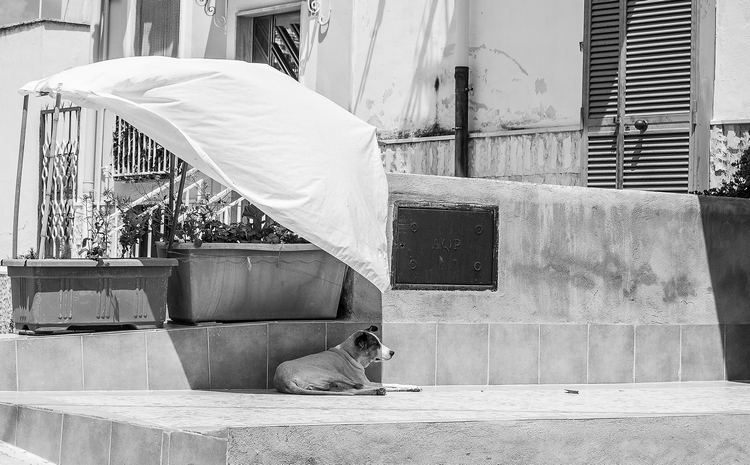 Concordo sul fatto che il cane si perda nell' ambiente. Il taglio del' ombra non l'avevo notato ed in effetti e accattivante. Sono stato attratto invece dal lenzuolo svolazzante. Lo spazio davanti forse è un po' sprecato. Proverei ad utilizzare un formato 4:3 per renderlo un po' più protagonista. La scena e' comunque molto simpatica e significativa.