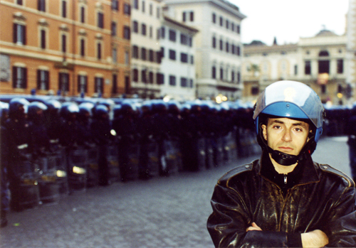 Che dire sul significato: io sono particolarmente attratto da queste fotografie, vedere i poliziotti schierati in questo modo mi dà sempre i brividi e un misto di rabbia e di paura...l'espressione del poliziotto è bella, quell'aria di superiorità e distacco verso la gente che li contraddistingue sempre in queste occasioni.