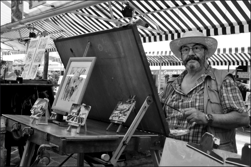 3) la composizione... troppe righe e troppi oggetti, che confondono, inoltre lui è troppo soffocato sul bordo... inoltre non si vede che è un pittore...