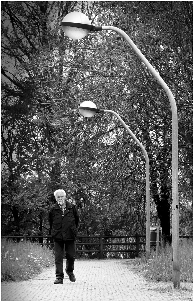 L'inquadratura funziona per il risalto che all'uomo dànno i due lampioni, quasi riflettori puntati su di lui. Del b/n trovo alquanto pesante (anche perché non abbastanza graduale) la vignettatura, in particolar modo sul lato sinistro.