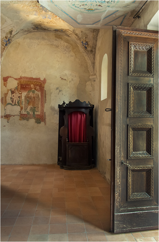 Calda su colori caldi, in una composizione dove il confessionale si trova ad equilibrare il "peso" dell'affresco da una parte e della porta dall'altra...