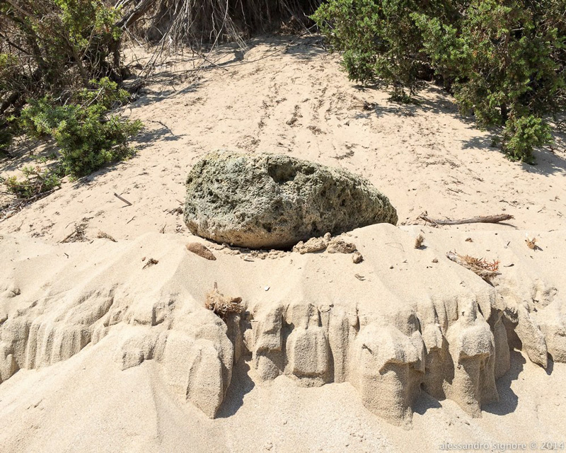 Particolare la prima foto che credo non sia scelta per caso,con una disposizione geometrica della pietra centrale come un occhio i cespugli scuri in angolo a chiudere lo sguardo e la sabbia della duna dal colore caldo,estivo.