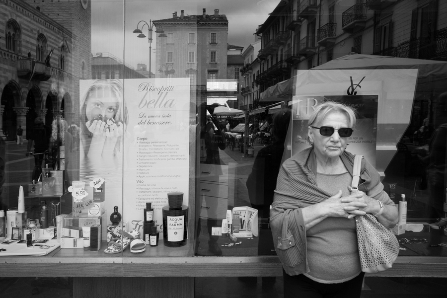 Ironica e per me ben fatta. In oltre, sembra proprio che la signora seppur nascosta dietro agli occhiali scuri, sia partecipe allo scatto.