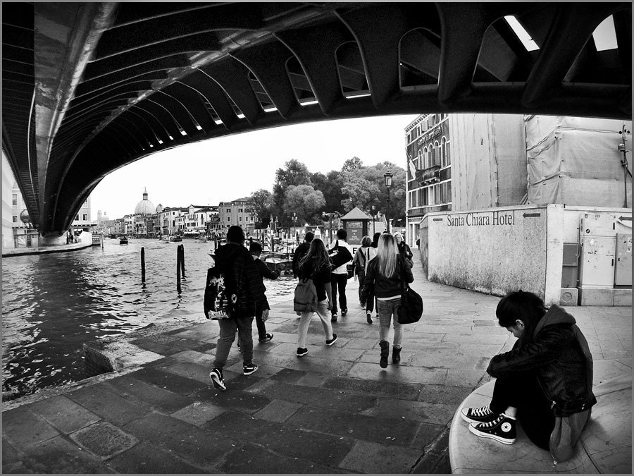 Quando fotografo con la "GoPro",senza mirino,senza monitor,ottica e fuoco fisso,170° di campo,deformazioni ottiche mostruose,nessuna regolazione possibile,poco più grande di uno scatolo di fiammiferi,ogni foto è per me una prima foto!Suggerimenti e critiche sempre ben accetti. Telecamera GoPro HD3 Better,f.2,8,1/512, iso 100. Venezia,sotto il "Calatrava".