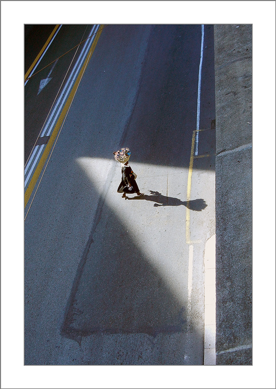 Carina la'mami' con quella specie di cesto fiorito in testa..la sua ombra proiettata ricorda a sua volta un fiore; il tutto ben inserito in un gioco di luce ed ombra ben visto.
