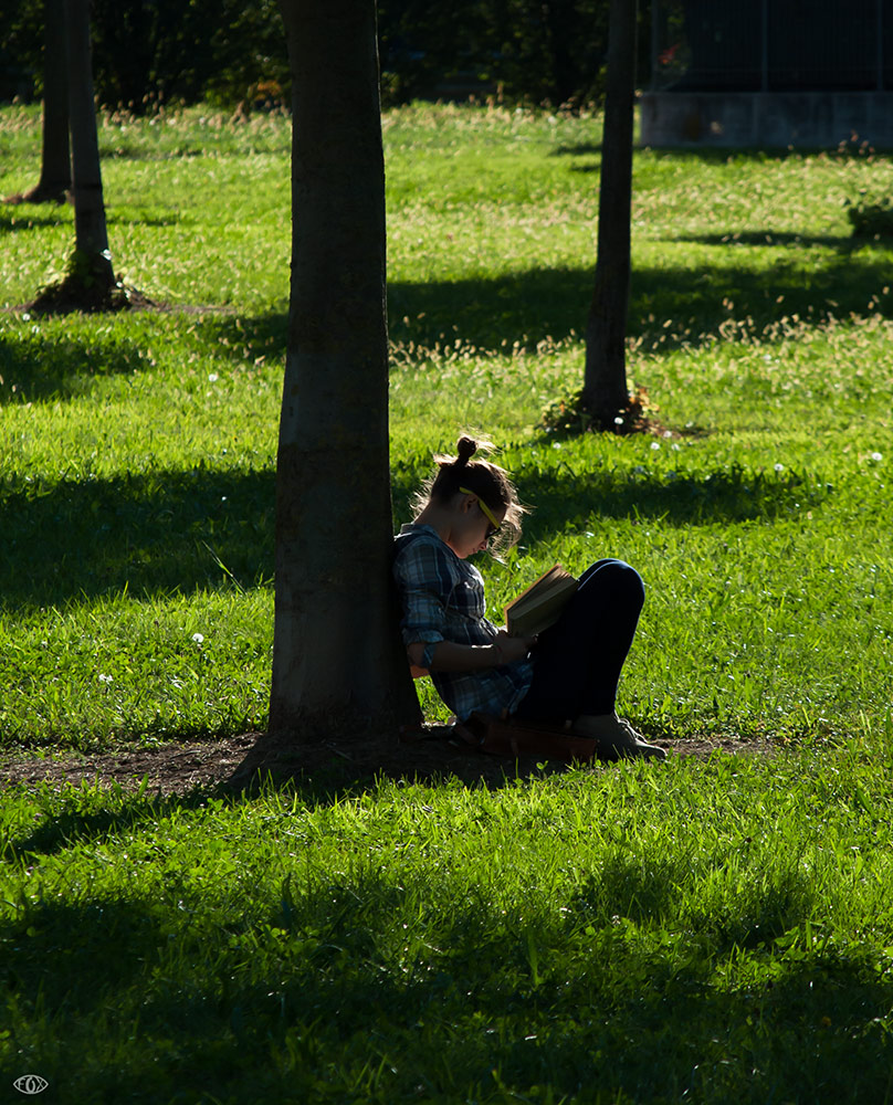 L'immagine ispira tranquillità, bella l'immersione nella lettura e nel verde.