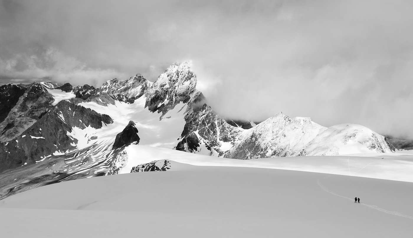 Immagine da brividi tanto è bella, niente da invidiare alle vette himalaiane per asperità e bellezza. L'immensità è accentuata dalla presenza umana anche la a destra dove si vedono avanzare dei puntolini umani.