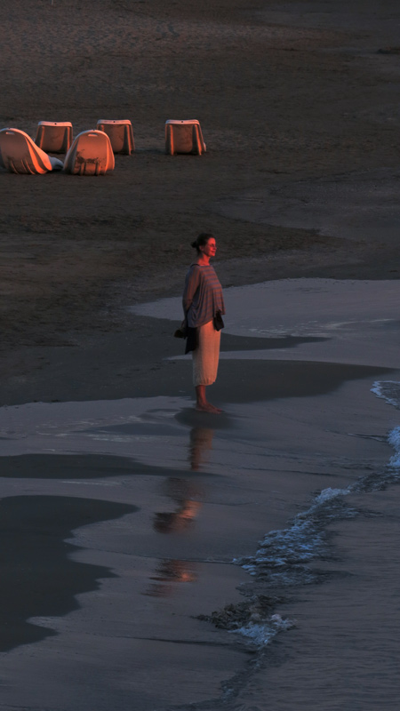 Molto bella anche la replica visiva di lei, che si allunga contro la battigia ,appena increspata dalle onde che si ritraggono. Luce preziosa e respiro ampio, solo da intuire ,dalla direzione del suo sguardo verso il mare. Per il titolo direi anch'io che non valorizza la scena.