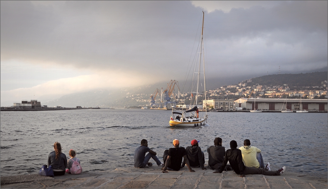 Uno scatto evocativo...molto forte la contrapposizione degli uomini di colore e della madre con la figlia, si intuisce che il desio degli uni non può essere il desio degli altri. Secondo me va bene anche il tenue colore che hai lasciato, rende ancora più struggente la scena...mi ricorda l'atmosfera del capolavoro di Ettore Scola "Una giornata particolare".