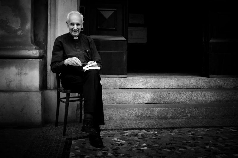 | Salvatore è bello questo scatto, è bella la complicità tra fotografo e soggetto, è bella l'ambientazione, è bella la luce, è bella, anche se mi pare ambivalente, l'espressione del prete. Secondo me è un ritratto riuscito bene |
