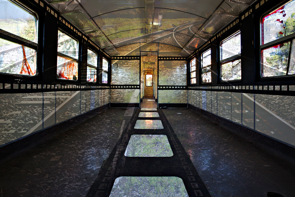 ..Perché l'idea del viaggio, con le due rotaie che corrono verso il fondo, si sovrappone bene a questo vagone vuoto e quasi asettico, quasi incredibilmente fermo nel nulla. Una contrapposizione che stride, che lo fa anche grazie alle tonalità fredde della terra e dell'erba che si notano nella zona bassa.. mentre il tono caldo di quel giallo e rosso in fondo tendono a lasciar correre il tutto e farlo muovere..