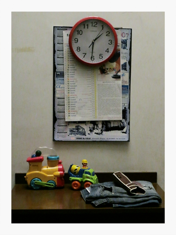 In basso altri segni del trascorrere del tempo (il trenino dell'infanzia, i pantaloni consunti dell'età adulta).