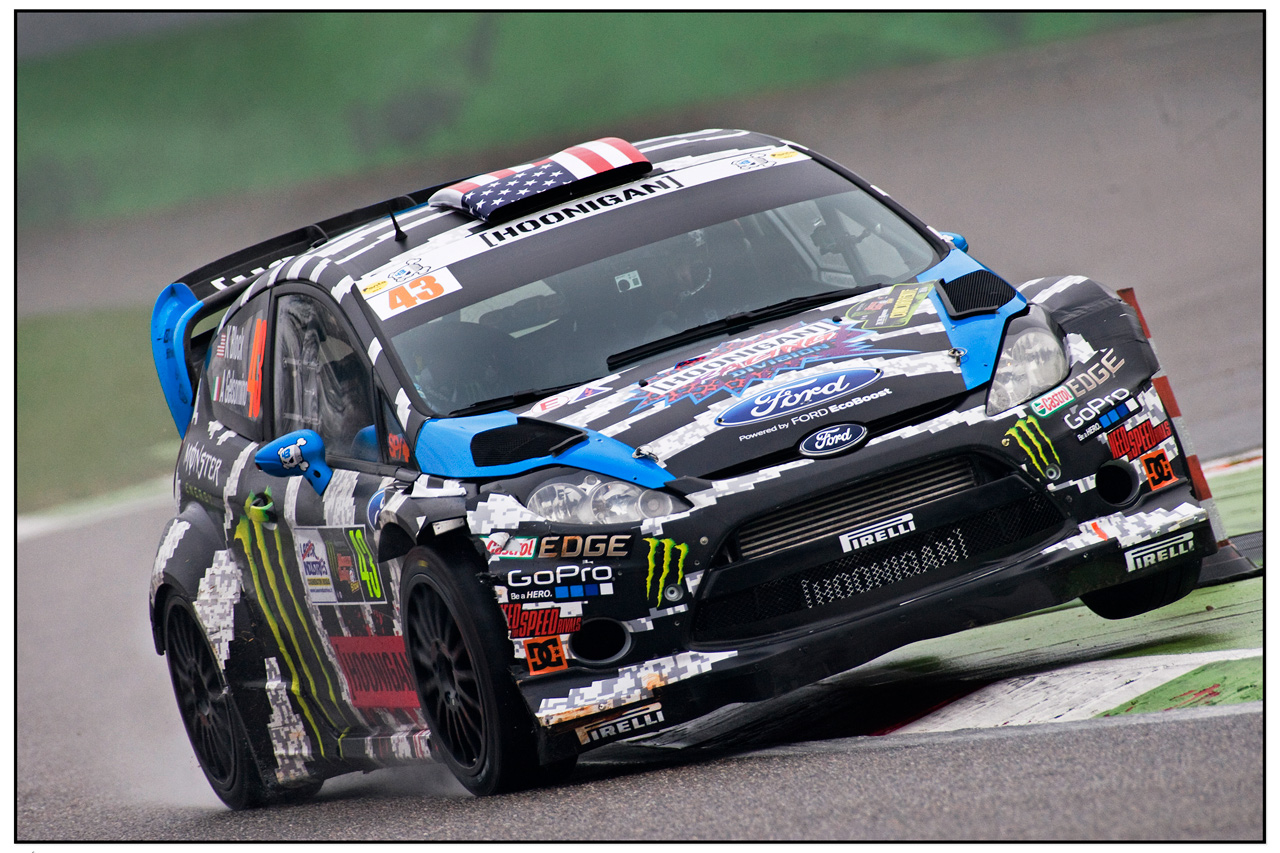 L'immagine in esame risulta immediatamente dinamica e per l'alzata in curva della ruota anteriore sinistra e per l'acqua che si sprigiona dai pneumatici del lato opposto.