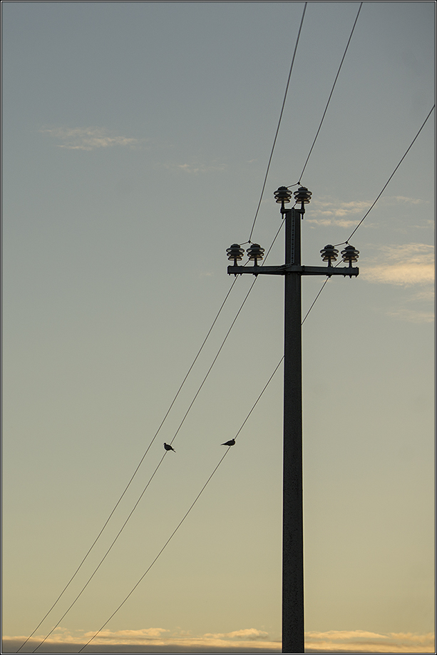 Veramente un bell'esercizio. Non è da tutti mettere in bell'ordine tralicci fili ed uccelli. Mi piace. Quella linea di nubi basse all'orizzonte sono una delizia.