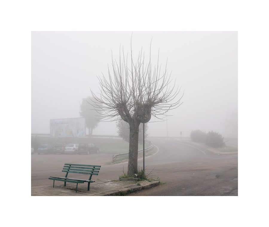Un buon scorcio, quasi surreale con questa panchina piazzata proprio in uno svincolo stradale e la foschia a mitigare i colori.