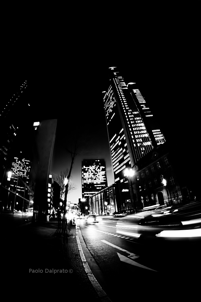 Bello e dinamico questo notturno metropolitano, bello il bw ed i contrasti scelti che sono perfetti per questa immagine. Mi piace molto anche la scelta del grandangolare estremo che ci catapulta nella scena!!!