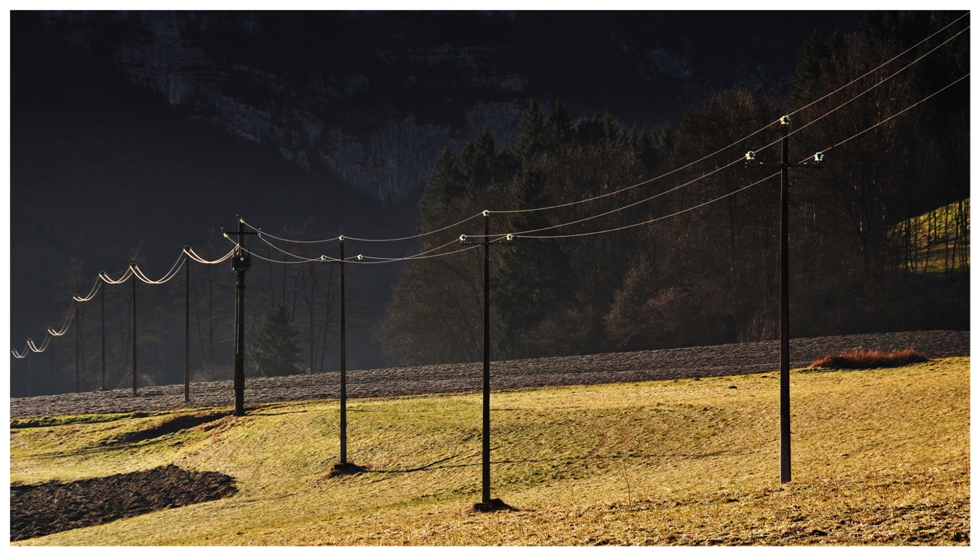| quasi totalmente concentrata sui pali e sui cavi però hai saputo tirar fuori un bel grafismo e la luce dura ti ha aiutato anche nei contorni del terreno con colori che si addicono a questo scatto. |