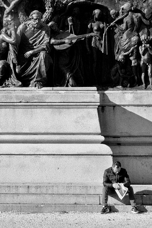 Uno scatto che offre una chiave di lettura immediata (la statua che sbircia il giornale balza subito agli occhi) e poi consente al fruitore di avventurarsi nella scena che si vuole raccontare.
