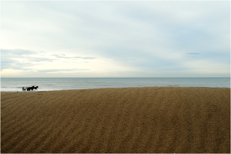 Acci Mauro. Sei imitatissimo oramai.... eheh , ma la tua zampata fotografica, l'originale, si distingue sempre . Solo tu potevi cercare il punto di ripresa perfetto, e trovare questa particolare curva sabbiosa, metà deserto e metà salina, che ci fa risalire per un attimo prima di scendere a mare, e, all'estremo, ecco i cavallini, quella che pare una biga d'altri tempi, che inizia l suo viaggio nel fotogramma. Un semplice tratto di spiaggia immediatamente si fa smisuratamente vasto al confronto con la minuscola silhouette, di una ampiezza emotiva che conquista.