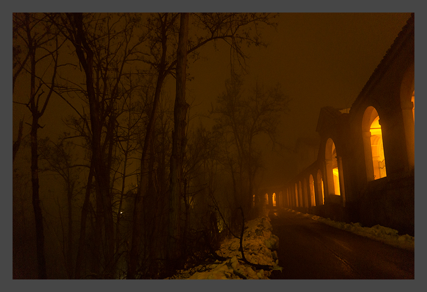 Bella immagine dalla tonalità molto suggestiva,ottima anche la composizione,giusta la tua idea di clonare le luci dietro gli alberi.Ciao,Sergio.  |
