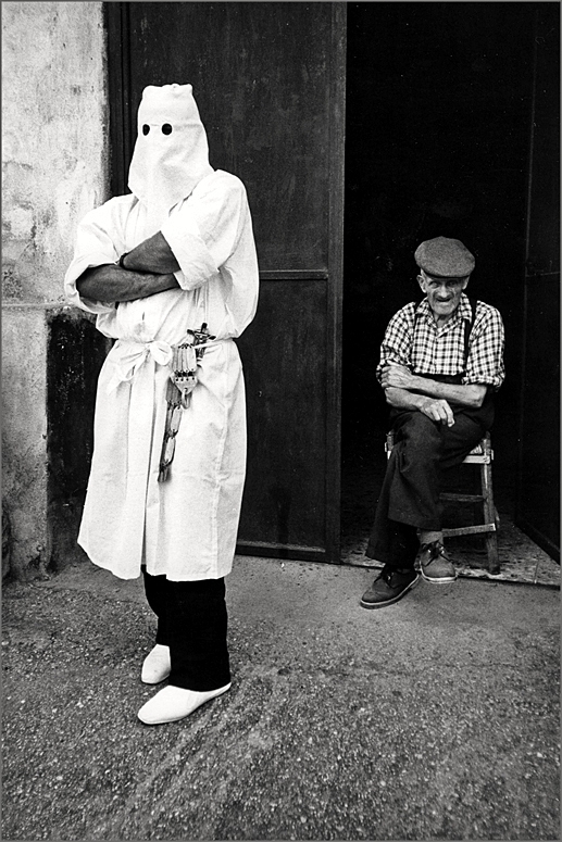 Grazie Antonino per l'attenzione e la fantasiosa lettura! Smile Quasi un passaggio di consegne tra l'anziano e l'incappucciato(flagellante),forse il figlio,in attesa della processione durante tutta la quale l'uomo si percuoterà a sangue le spalle con il flagello metallico che ha nella cintura.L'anziano,che in passato avrà partecipato tante volte anche lui a questo rito,ora assiste.Ciao,Sergio. Smile