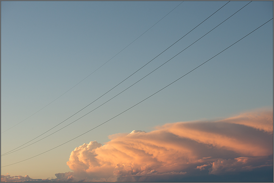Concordo con il commento di Francesco. Questa volta, la matericità delle nuvole e la loro tonalità sono così belle che, avrebbero tenuto in piedi la foto da sole senza i cavi. Magari dandogli anche più spazio all'interno dell'inquadratura.