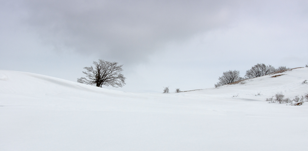 Delicata, resa con una forte, ma non spiacevole, morbidezza. Diciamo che essendo immersa in una luce diffusa, manca un pizzico di verve, e soprattutto ha una composizione non scorretta ma non equilibratissima. Infatti la parte alla mia sinistra, in parte la avrei sacrificata, ma così facendo perderesti forse la parte più carina, quel solco a virgola, sinuoso nella neve collinare.
