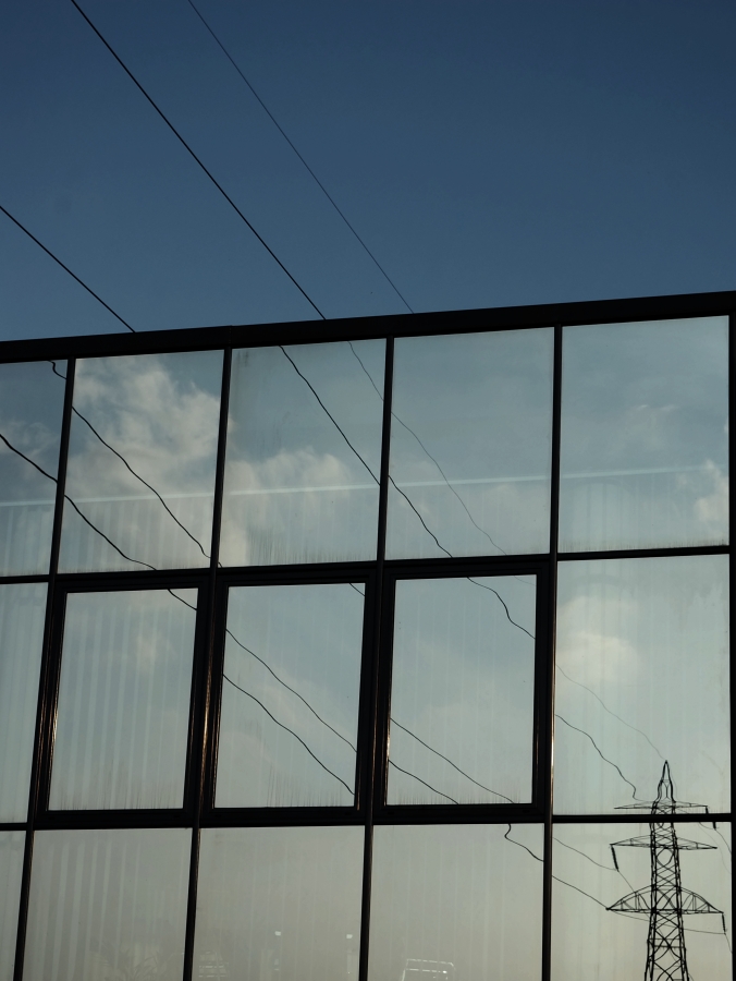 Mi piacciono questi tralicci narcisi, che approfittano delle facciate a vetri per pavoneggiarsi! Però la diagonalità della ripresa un po' disordinata non mi convince del tutto. Ho provato a modificare, il mio risultato è forse più banale però , nella fretta poi ho sacrificato un frammento di traliccio, però come idea, una certa simmetria non mi spiacerebbe. Infatti resta comunque la fuga libera e asimmetrica dei cavi nell'azzurro. Solo per dare una idea, se vuoi la tolgo.