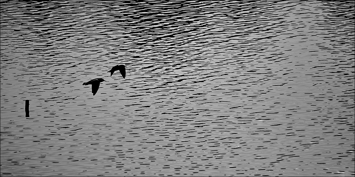 Ho l'impressione che la tavolozza sia troppo grigia per riuscire a dare il necessario stacco alle silhouettes. Il formato panoramico con gli elementi tutti addossati al margine sinistro lo trovo dispersivo e non adatto.