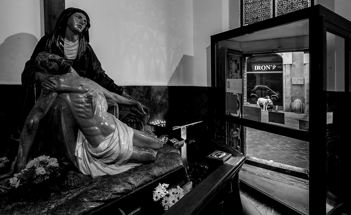 Ho avuto qualche difficoltà nel trovare un nesso tra il gruppo statuario della pietà ed il sentimento di pietà e di partecipazione verso quella persona che si intravede accanto alla vetrina per via della distanza e della presenza ingombrante rappresentata dalla smart.