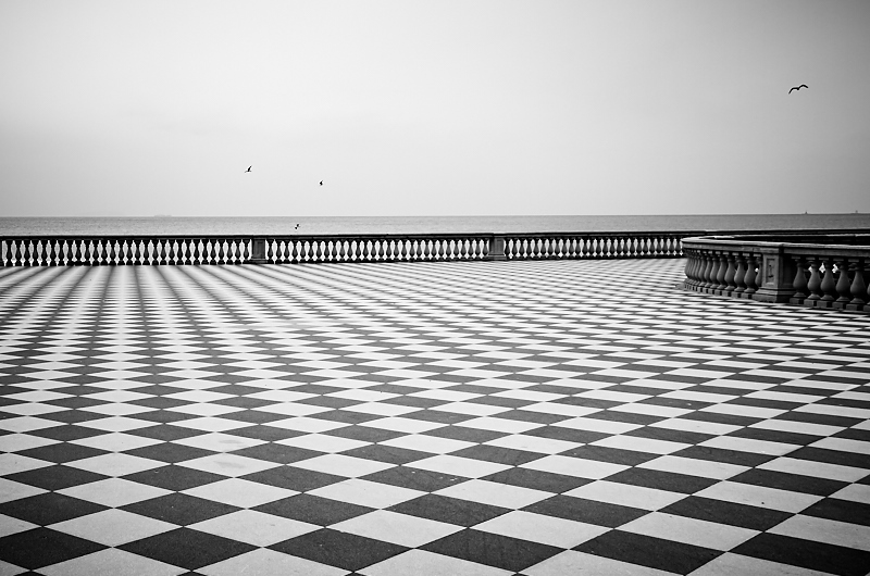 Ottimo b/n per questo pavimento a scacchiera. I gabbiani sono l elemento che impreziosisce lo scatto.