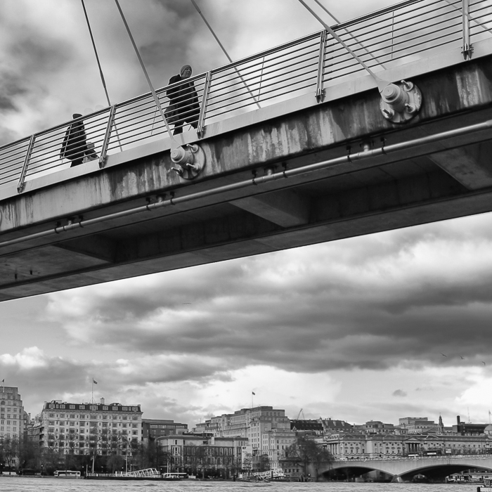 Scalettature lungo le linee oblique (per es. il mancorrente sul ponte), bordi bianchi lungo le sagome in controluce (per es. l'uomo contro il cielo oppure il bordo inferiore del ponte). Ancor più evidenti in quanto nella parte inferiore il b/n sembra più morbido e pulito.